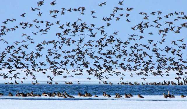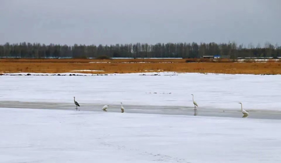 在雁窩島國家級生態(tài)濕地自然保護區(qū)內(nèi)的冰面上,白鸛、灰鸛還有小水雞,三五一組,有的悠閑散步,有的仰頭眺望,有的在融化的雪水中覓食,還有的在低空盤旋。比往年提前10天到來的候鳥,為雁窩島增添了初春的氣息和生機。