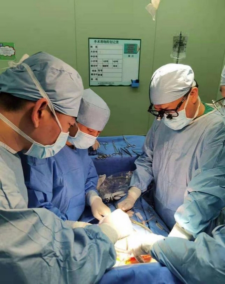 普外科主任崔云甫教授(右)和膽胰外科蘇志雷副教授(左2)應用經(jīng)肝臟動脈灌注驅血技術完成