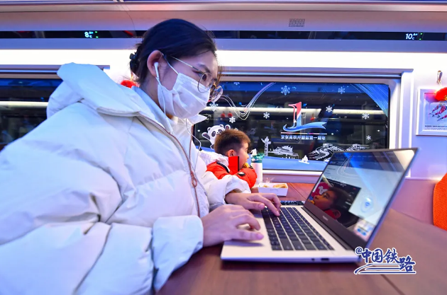 藍(lán)色的燈光、潔白的雪花、絢麗動感的車窗貼紙……在京張高鐵服役的復(fù)興號智能動車組將冬奧元素、運(yùn)動精神和鐵路文化融為一體。