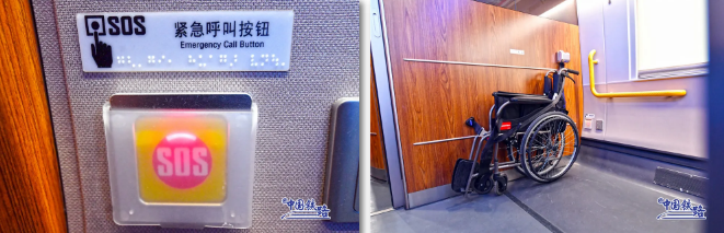 全列覆蓋免費(fèi)高速Wi-Fi,旅客在旅行途中可以隨時使用電腦辦公、手機(jī)娛樂。車廂內(nèi)設(shè)有大件行李存放處、無障礙衛(wèi)生間等設(shè)施,并在殘疾人座位區(qū)配備輪椅固定裝置、SOS按鈕等。