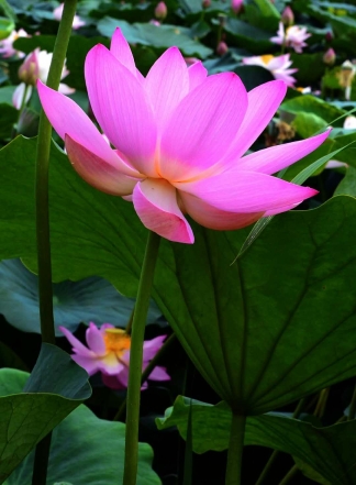 荷蓋呈圓形,邊口有彎曲、高低的波狀起伏感。新葉較小,初出水面時(shí)卷起呈角狀。小荷才露尖尖角,形象生動(dòng)地描寫(xiě)出了新葉的這種狀態(tài)。