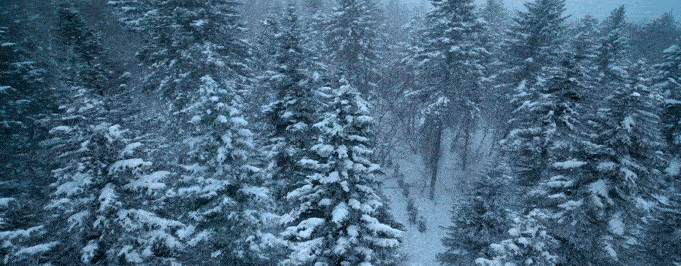 大幕拉開,風(fēng)雪交加,一望無際的茫茫林海里,是故事的開局之地。航拍第一視角的真實(shí)感鏡頭為我們呈現(xiàn)出開局的困頓感和林海雪原環(huán)境的壯美大氣。