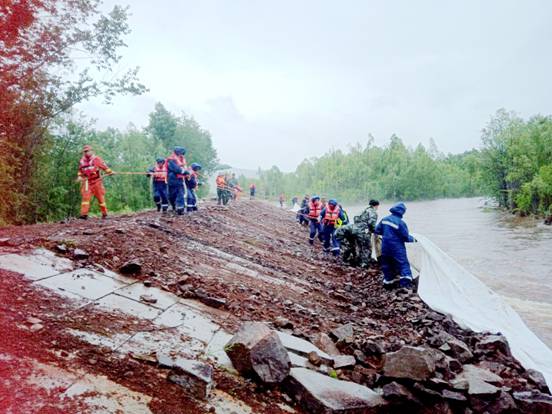 6月18日,呼中鎮(zhèn)景觀大壩部分堤壩出現(xiàn)險(xiǎn)情,護(hù)堤水泥塊被沖塌陷,鎮(zhèn)內(nèi)地勢(shì)低洼地帶居民房屋、田地進(jìn)水,呼中鎮(zhèn)聯(lián)合區(qū)公安局、區(qū)應(yīng)急管理局、區(qū)水務(wù)局、呼中林業(yè)局專業(yè)森林消防大隊(duì)等單位,共同搶修堤壩、抗擊洪水,疏通受災(zāi)居民住戶的水道,保護(hù)人民群眾生命財(cái)產(chǎn)安全。