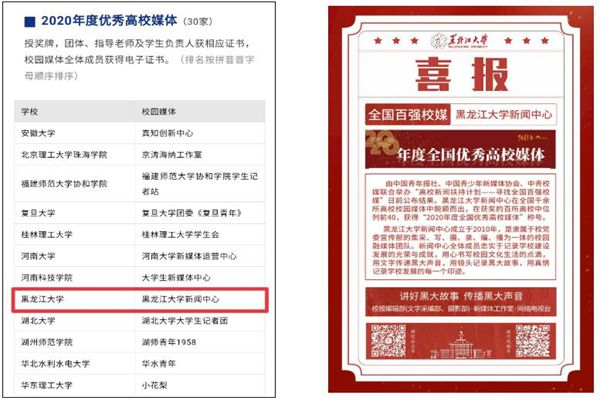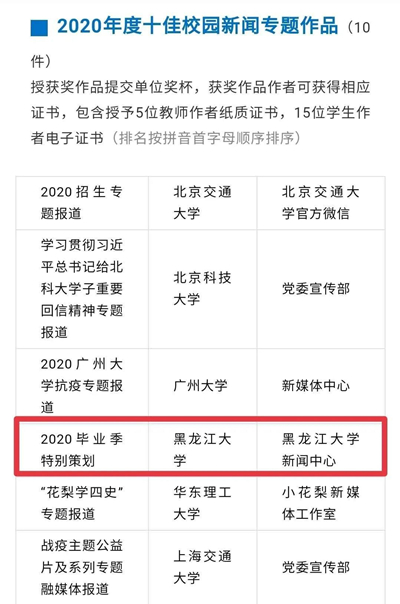 據(jù)了解,在此次全國(guó)百?gòu)?qiáng)校園媒體評(píng)比中,黑龍江大學(xué)新聞中心位列前40,獲評(píng)“2020年度全國(guó)優(yōu)秀高校媒體”稱號(hào),創(chuàng)造了該校參評(píng)以來的最好成績(jī)。