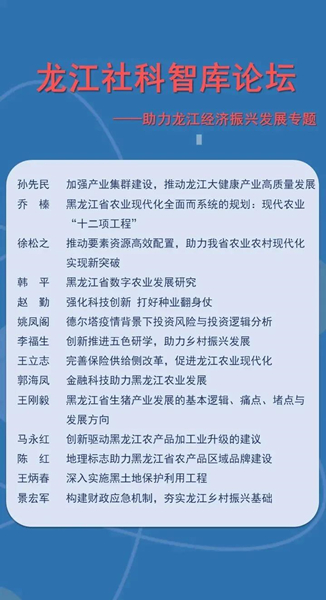 來自省內(nèi)高校、科研院所、企業(yè)的14位專家學(xué)者在會(huì)上圍繞“助力龍江經(jīng)濟(jì)振興發(fā)展”這一主題,分別就“加強(qiáng)產(chǎn)業(yè)集群建設(shè),推動(dòng)龍江大健康產(chǎn)業(yè)高質(zhì)量發(fā)展”“黑龍江省農(nóng)業(yè)現(xiàn)代化全面而系統(tǒng)的規(guī)劃:現(xiàn)代農(nóng)業(yè)‘十二項(xiàng)工程’”“推動(dòng)要素資源高效配置,助力我省農(nóng)業(yè)農(nóng)村現(xiàn)代化實(shí)現(xiàn)新突破”“黑龍江省數(shù)字農(nóng)業(yè)發(fā)展研究”等主題進(jìn)行了發(fā)言。