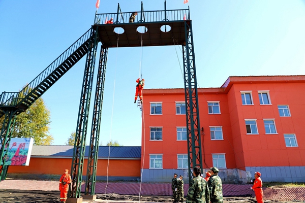 圖為阿木爾林業(yè)局“森防鐵軍”利用新安裝的索滑降塔苦練索滑降技能。