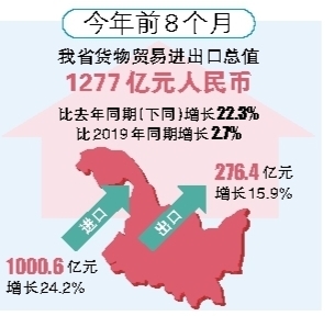 黑龍江日?qǐng)?bào)訊(黑龍江日?qǐng)?bào)全媒體記者 付宇)記者從哈爾濱海關(guān)獲悉,今年前8個(gè)月,我省貨物貿(mào)易進(jìn)出口總值1277億元人民幣,比去年同期(下同)增長22.3%,比2019年同期增長2.7%。其中,出口276.4億元,增長15.9%;進(jìn)口1000.6億元,增長24.2%。