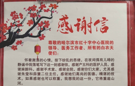 黑龍江經(jīng)濟網(wǎng)訊(孫麗霞 葉鴻 梁新立)“懷著激蕩的心情,按下紛亂的思緒,在夜間偶有兒啼的靜謐中我落筆寫下這一封感謝信……如果感謝也可以稱重,我想我的這一份,它將重逾山河。”近日,哈爾濱市紅十字中心醫(yī)院(哈爾濱醫(yī)科大學附屬哈爾濱婦產(chǎn)醫(yī)院)產(chǎn)五科收到了來自患者家屬李先生的一封感謝信和一面錦旗。