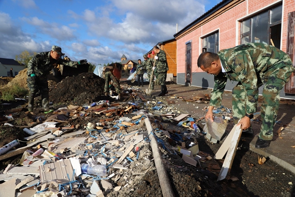 圖為阿木爾林業(yè)局龍河林場黨員干部職工清理精品民宿房前的建筑垃圾。王力 攝