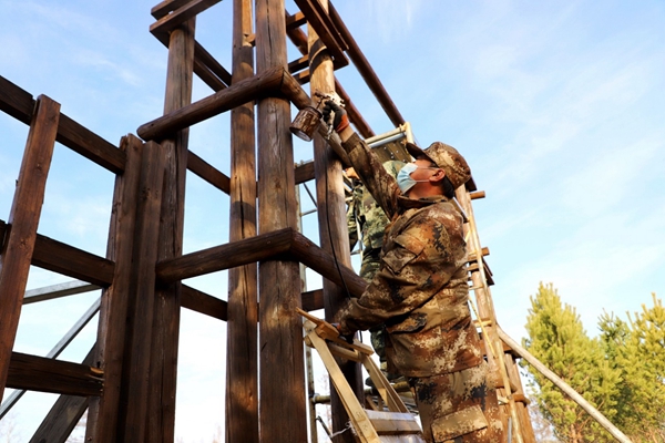 圖為阿木爾林業(yè)局黨員干部職工為興安林場精品民宿大門“美顏”,為安裝“得勝營”牌匾做準備。王力 攝