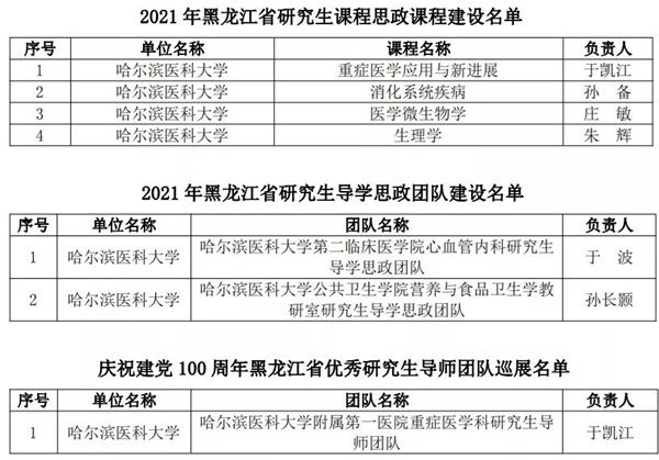 黑龍江經(jīng)濟網(wǎng)訊(黑龍江日報全媒體見習(xí)記者董廣碩 商祺)為貫徹落實國家《關(guān)于全面落實研究生導(dǎo)師立德樹人職責(zé)的意見》《高等學(xué)校課程思政建設(shè)指導(dǎo)綱要》《關(guān)于加快新時代研究生教育改革發(fā)展的意見》精神,按照《關(guān)于加快新時代黑龍江省研究生教育改革發(fā)展的實施意見》要求,日前,經(jīng)全省研究生培養(yǎng)單位遴選推薦,黑龍江省研究生課程思政教育聯(lián)盟專家委員會評審,省學(xué)位委員會、省教育廳批準,哈爾濱醫(yī)科大學(xué)共有26個項目獲批省級立項,其中研究生課程思政課程建設(shè)項目4個、研究生導(dǎo)學(xué)思政團隊(導(dǎo)師)建設(shè)項目2個、研究生課程思政案例19個,慶祝建黨100周年巡展優(yōu)秀研究生導(dǎo)師團隊1支。