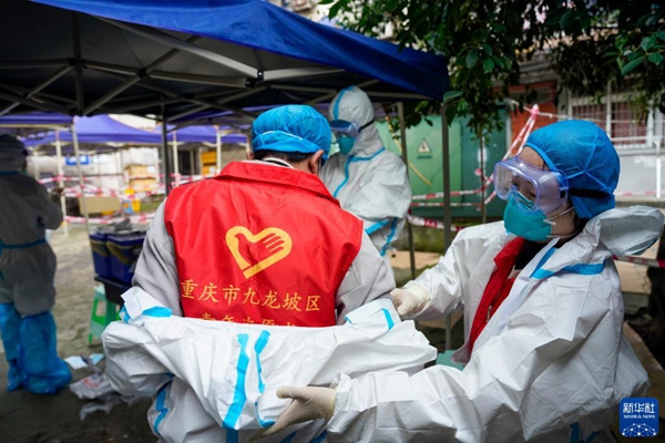 11月4日,在重慶九龍坡區(qū)九龍街道,青年志愿者相互幫助穿防護服。