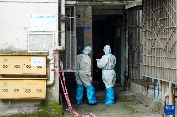 11月4日,在重慶九龍坡區(qū)九龍街道,兩名身穿防護服的青年志愿者走向自己負責的樓棟。
