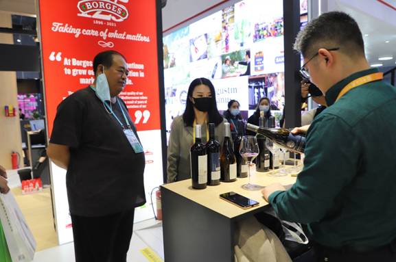 圖為大興安嶺林業(yè)集團(tuán)公司黨委副書記、總經(jīng)理李軍(左二)向法國參展企業(yè)推介北極冰藍(lán)莓酒莊紅酒系列產(chǎn)品(王力/攝)