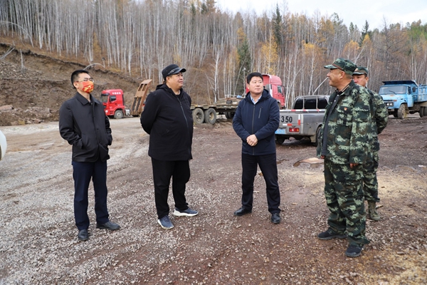 圖為阿木爾林業(yè)局黨委書(shū)記胡守慶(左二)慰問(wèn)筑路一線(xiàn)的多種經(jīng)營(yíng)公司干部職工(王力/攝)
