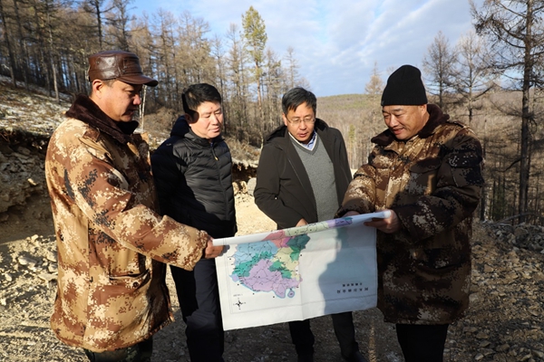 圖為阿木爾林業(yè)局黨委副書(shū)記、局長(zhǎng)韓鳳泉(右二)深入到2—1線(xiàn)檢查新開(kāi)通路線(xiàn)施工進(jìn)展情況(王力/攝)