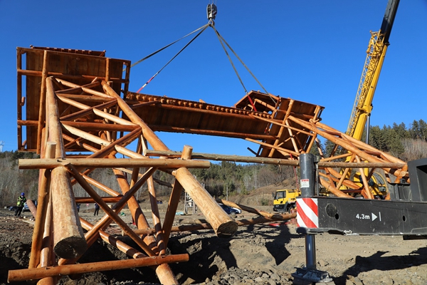 早上10點(diǎn)58分,只見(jiàn)平靜的林業(yè)局薩布素軍馬場(chǎng)頓時(shí)熱鬧了起來(lái),兩臺(tái)大型起重機(jī)發(fā)動(dòng)機(jī)嗡嗡作響,一東一西緩慢吊起10多噸重的大門,因偏向一側(cè)首次作業(yè)沒(méi)有成功。安裝技術(shù)人員調(diào)整重心點(diǎn),第二次試舉,并在一臺(tái)裝載機(jī)的協(xié)助下,調(diào)整機(jī)位,歷時(shí)2個(gè)多小時(shí),才將具有濃郁驛站文化風(fēng)格的高10米、寬14米的木質(zhì)大門,矗立在平地上。
