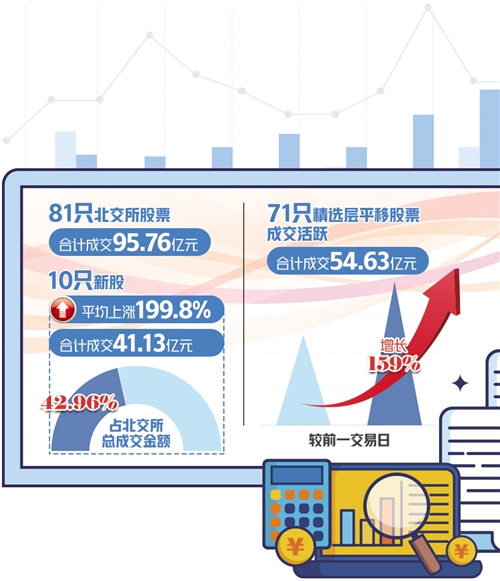 北交所首個交易日運(yùn)行平穩(wěn),81只股票合計成交95.76億元。首批上市交易的10只新股全線上揚(yáng),盤中均觸發(fā)兩次臨時停牌。截至收盤,10只新股平均較發(fā)行價上漲199.80%。71只從精選層平移至北交所的股票漲跌互現(xiàn)。