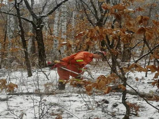 在經(jīng)過一段緊張嚴(yán)格的產(chǎn)前技能及安全培訓(xùn)后,紅星林場職工們備齊生產(chǎn)工具和防護(hù)物品,每天頂著未褪盡的夜色出發(fā),天剛冒亮就開工,在積雪覆蓋的林間不停穿行,鋸手手持割灌機(jī)把作業(yè)規(guī)程要求的各類林內(nèi)枯死、風(fēng)折枝干伐除,后面的歸堆工緊隨其后,把割下的枯干枝條有序的理順碼成堆。各小組分工明確,配合嫻熟,漫山雜亂的倒木藤條在工人們的手下被梳理的清晰利落,寂靜的山林也在機(jī)器的轟鳴和工人們的笑聲中熱鬧起來。