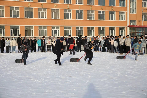 組織開展拉輪胎跑比賽。拉輪胎跑比賽在各年級間進(jìn)行,每班6名選手,50米往返,以時間少者為勝。隨著裁判老師一聲令下,比賽開始,選手們立馬拉起了輪胎奮力向前沖刺,克服雪地不利的條件,參賽選手飛快地向終點奔跑,掌聲、加油聲響徹操場。冬日的操場上,一個個