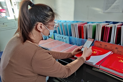 職工在礦自辦“霍拉盆先鋒 智慧黨建平臺”進行黨的十九屆六中全會精神知識測試(李云田 攝)