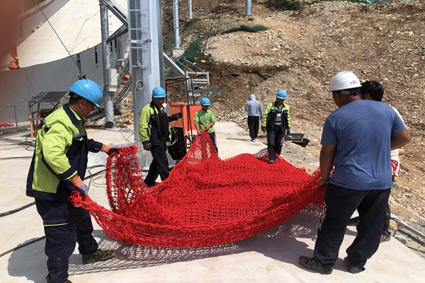 阿木爾林業(yè)局產(chǎn)業(yè)職工楊輝(左一)與其他職工在國(guó)家跳臺(tái)中心安裝防護(hù)網(wǎng)。
