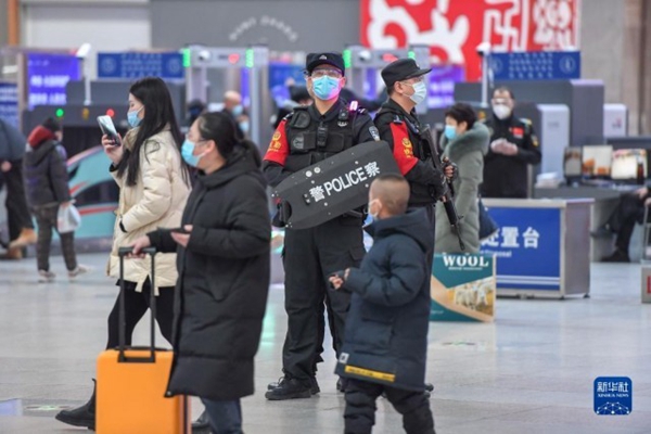 1月20日,在長春火車站候車大廳,馬宇航(后中)與同事一起巡邏。