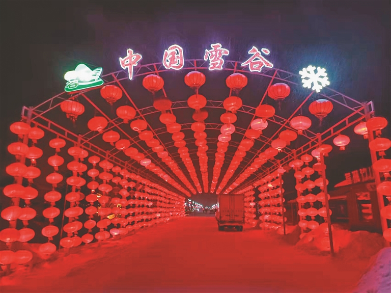 當(dāng)我們抵達(dá)雪谷的時(shí)候,暮色已濃,天地間覆蓋了一片黑色的幕布。但雪谷中心街道上,聳立著由上千只大紅燈籠排列組合的拱形門,燈火輝煌,延續(xù)百米開外。門的頂端中央鑲嵌著“中國(guó)雪谷”四個(gè)金色大字,格外醒目。我們停下車拍照,并就近住宿,溫暖的火炕讓我們很快進(jìn)入夢(mèng)鄉(xiāng)。