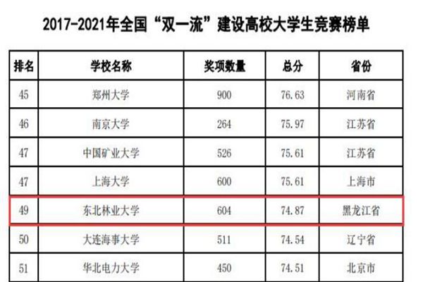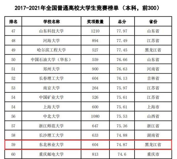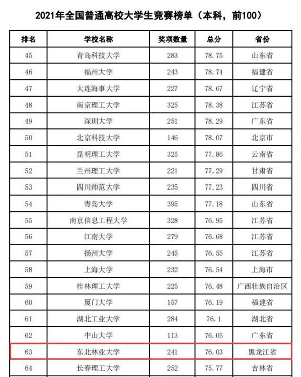 據(jù)悉,中國高等教育學(xué)會自2017年2月啟動《高校競賽評估與管理體系研究》項目以來,中國高等教育學(xué)會已經(jīng)連續(xù)發(fā)布六輪榜單,這是我國第一個專注高校創(chuàng)新人才培養(yǎng)暨學(xué)科競賽成果的排行榜,是檢驗高校人才培養(yǎng)質(zhì)量的重要途徑。為從更長的時間段了解各高校大學(xué)生競賽發(fā)展態(tài)勢,特在今年發(fā)布了“六輪總榜單”,時間跨度從2012年到2021年,東北林業(yè)大學(xué)以總分73.42,位列全國第63位。