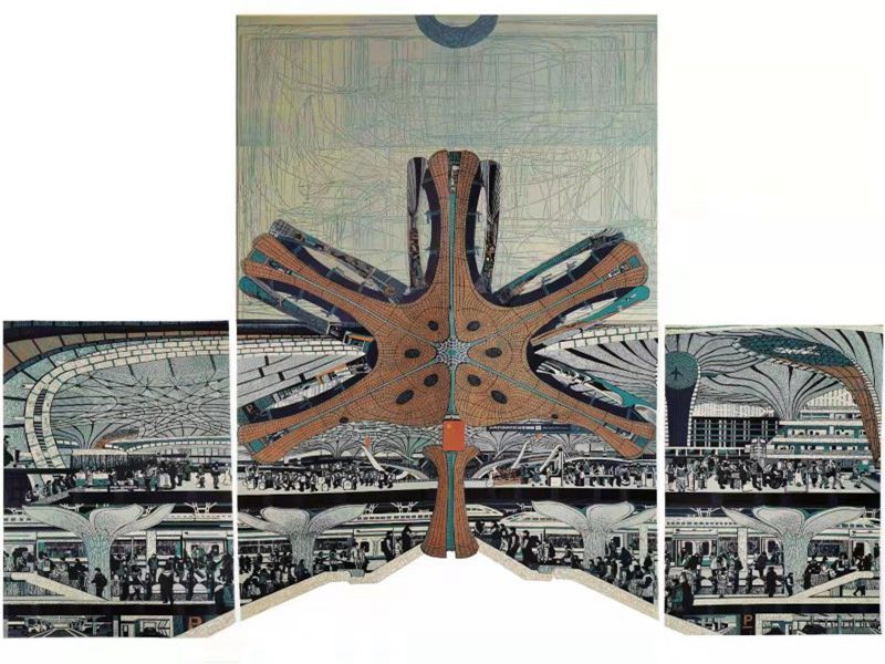版畫作品《鳳凰展翅——北京大興國際機場》描繪了北京大興機場如鳳凰展翅、騰飛天際的恢宏景象。畫家采用空間翻轉(zhuǎn),將機場內(nèi)外現(xiàn)代化、人性化、藝術化的先進設施和繁忙的國際交流同時表現(xiàn)出來。