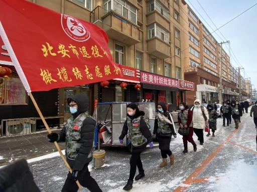在北安,一走進(jìn)北安步行街,首先映入眼簾的是身著迷彩馬甲的退役軍人志愿者們,向沒(méi)佩戴口罩的市民免費(fèi)發(fā)放口罩,并主動(dòng)宣傳疫情防控知識(shí);頂著寒風(fēng),將步行街內(nèi)的積雪清理干凈,方便了市民的通行;幫助社區(qū)居民正確分類處置各類生活垃圾。這是北安市退役軍人服務(wù)中心、“橄欖綠”退役軍人志愿者服務(wù)隊(duì)正在踐行著幸福北安,文明有我。