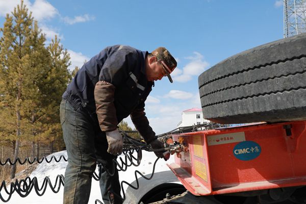 阿木爾林業(yè)局多種經(jīng)營公司職工在保養(yǎng)拖掛車的制動系統(tǒng)(王力 攝)