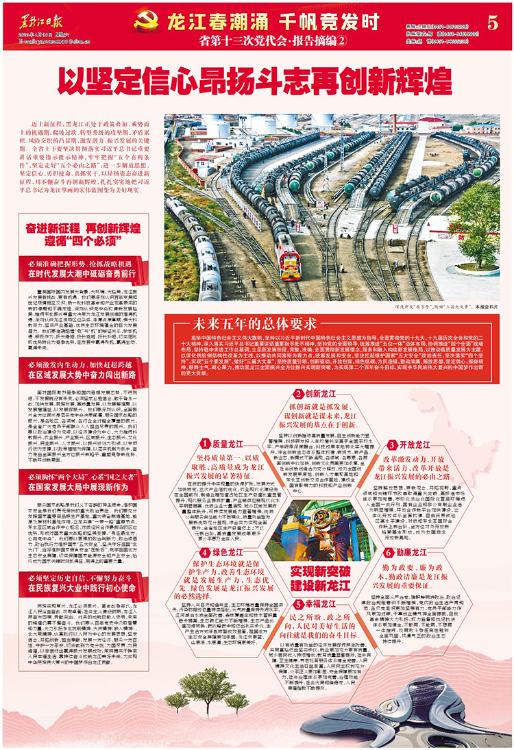 邁上新征程,黑龍江正處于政策疊加、乘勢而上的機(jī)遇期,爬坡過坎、轉(zhuǎn)型升級的攻堅期,矛盾累積、風(fēng)險交織的凸顯期,激發(fā)潛力、振興發(fā)展的關(guān)鍵期。全省上下要堅決貫徹落實習(xí)近平總書記重要講話重要指示批示精神,牢牢把握“五個有利條件”,堅定走好“五個必由之路”,進(jìn)一步解放思想、堅定信心、勇?lián)姑⒄孀嵏?,以昂揚姿態(tài)奮進(jìn)新征程,用不懈奮斗再創(chuàng)新輝煌,扎扎實實地把習(xí)近平總書記為龍江擘畫的宏偉藍(lán)圖變?yōu)槊篮矛F(xiàn)實。
