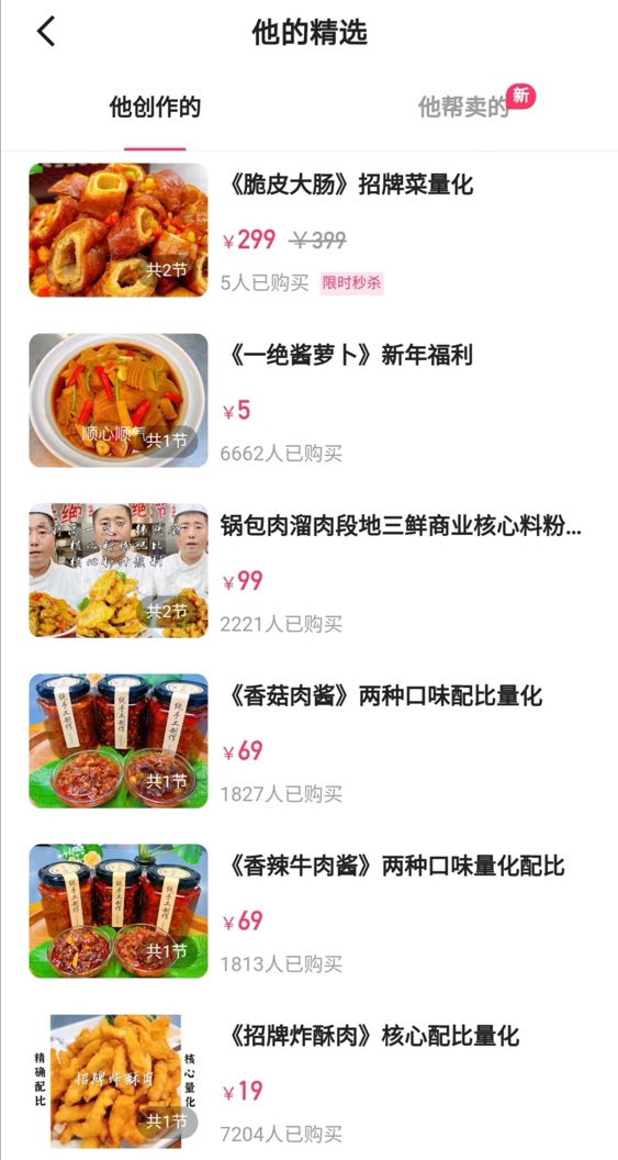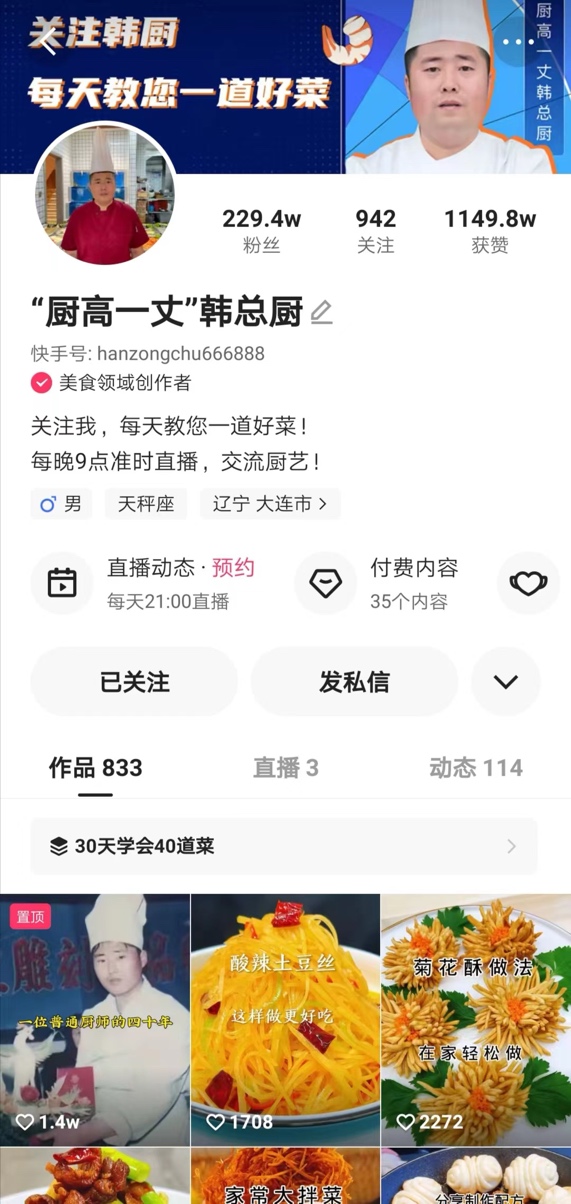 作為一位有著25年美食領(lǐng)域從業(yè)經(jīng)驗(yàn)的老廚師,韓總廚憑借一手精湛的廚藝,來(lái)到快手后很快就積累了上萬(wàn)粉絲,為他打造付費(fèi)課程奠定了基礎(chǔ)?!皩?duì)比了其他達(dá)人的內(nèi)容,我覺(jué)得自己還是有一定的內(nèi)容優(yōu)勢(shì)的,所以也試著做了課程,看看是否有人愿意購(gòu)買?!?
