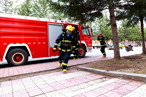 阿木爾林業(yè)局城鎮(zhèn)消防大隊戰(zhàn)斗員迅速到達模擬火警點,開展救助行動(王力 攝)