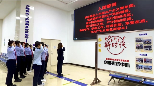 重溫入團(tuán)誓詞,匯聚青春力量。為進(jìn)一步引導(dǎo)廣大團(tuán)員青年厚植愛國、愛黨、愛稅收事業(yè)的深厚情感,進(jìn)一步增強(qiáng)團(tuán)支部的組織力量,安達(dá)市稅務(wù)局團(tuán)支部開展重溫入團(tuán)誓詞活動,在莊嚴(yán)的團(tuán)歌聲中,11名安達(dá)市稅務(wù)局奮戰(zhàn)在稅收一線的團(tuán)員干部在團(tuán)支部書記的帶領(lǐng)下,面向誓詞莊嚴(yán)宣誓。宣誓完畢后,安達(dá)稅務(wù)青年紛紛表示,將立足本職、埋頭苦干,用一流的業(yè)務(wù)能力為納稅人繳費(fèi)人帶來一流的納稅服務(wù)體驗(yàn),為安達(dá)稅收事業(yè)奉獻(xiàn)青春力量。