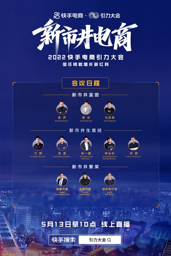 2022年快手電商引力大會于5月13日上午10點在北京舉行。2022快手電商引力大會議程包括新市井藍(lán)圖、新市井生意經(jīng)、新市井繁榮三大篇章。