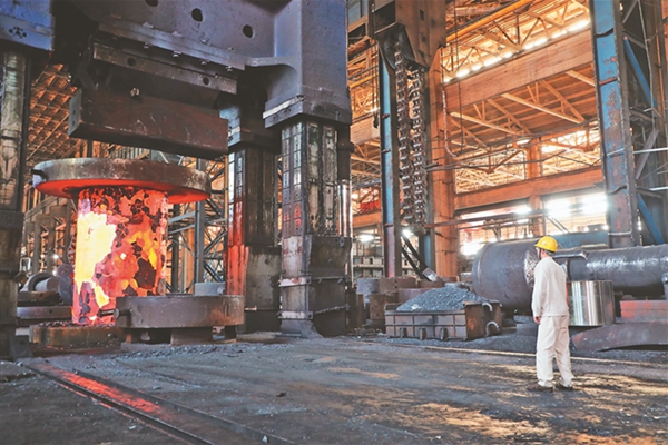 在中國(guó)一重集團(tuán)有限公司,工人在車間內(nèi)忙碌(5月19日攝)。 新華社記者 唐鐵富攝