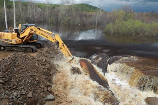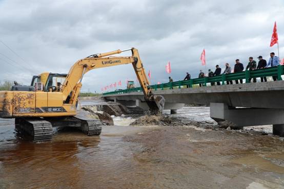 阿木爾林業(yè)局調(diào)派大型機(jī)械設(shè)備,挖開楚龍溝河大橋臨時便道,進(jìn)行泄洪,確保G111國道安全(王力 攝)