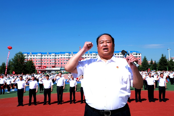 青年黨員母立巖手舉黨旗健步跑向藍(lán)莓廣場主席臺(tái),把黨旗交到了林業(yè)局黨委書記胡守慶手中,胡守慶揮舞黨旗,臺(tái)下黨員齊聲說道:“不忘初心、牢記使命”。