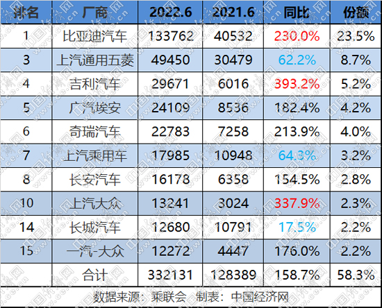 在乘聯(lián)會(huì)發(fā)布的6月新能源乘用車(chē)批發(fā)銷(xiāo)量廠商排名(TOP15)中,傳統(tǒng)品牌占據(jù)10席,共計(jì)銷(xiāo)售33.2萬(wàn)輛,同比增長(zhǎng)158.7%,市場(chǎng)份額接近六成,達(dá)到58.3%,1-6月,傳統(tǒng)品牌新能源累計(jì)銷(xiāo)售144.2萬(wàn)輛,同比增長(zhǎng)134.4%,份額同樣接近六成,為58.5%。