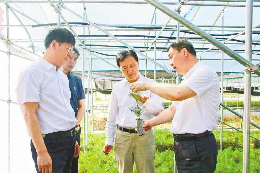 翟青(中)在伊春森工集團公司紅松種苗繁育基地調研(劉博/攝)。
