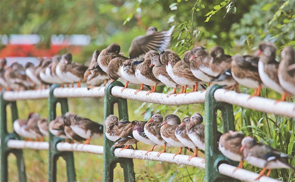 13日,哈爾濱市兆麟公園鴛鴦湖邊,近300只野生鴛鴦在湖邊欄桿上休息,密密麻麻排出近百米的“長(zhǎng)龍”。公園專職看護(hù)鴛鴦的職工車春虎介紹,目前在公園內(nèi)及周邊出生的小鴛鴦已經(jīng)長(zhǎng)大,加上從周邊濕地飛來(lái)的鴛鴦,每天早晚來(lái)鴛鴦湖覓食的鴛鴦數(shù)量接近300只,這一數(shù)量還在持續(xù)增長(zhǎng)?!邦A(yù)計(jì)國(guó)慶節(jié)前后,數(shù)量能超400只?!?/span>