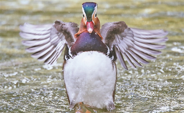 每天早晚,車春虎都會(huì)把準(zhǔn)備好的麻籽、玉米、面包蟲等鳥食撒到湖上、岸邊,鴛鴦撒著歡覓食。吃完食兒,它們不時(shí)水上舒展羽翅,撲騰戲水,湖面上水花四濺,生機(jī)盎然。車春虎介紹,這些鴛鴦?wù)跒槟线w越冬做著體能儲(chǔ)備,每年10月中下旬它們就會(huì)離開繁殖地哈爾濱,飛到溫暖的南方越冬。