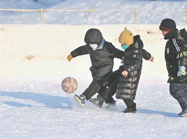 近日,在哈爾濱市道里區(qū)體育公園內(nèi),市民和游客齊聚滑冰場,孩子們你追我趕,叫喊聲、歡笑聲不絕于耳。踢雪地足球、抽冰尜、玩雪滑梯、堆雪人……家長孩子一起“撒歡兒”,快樂解壓。