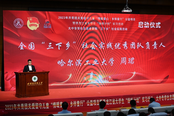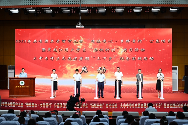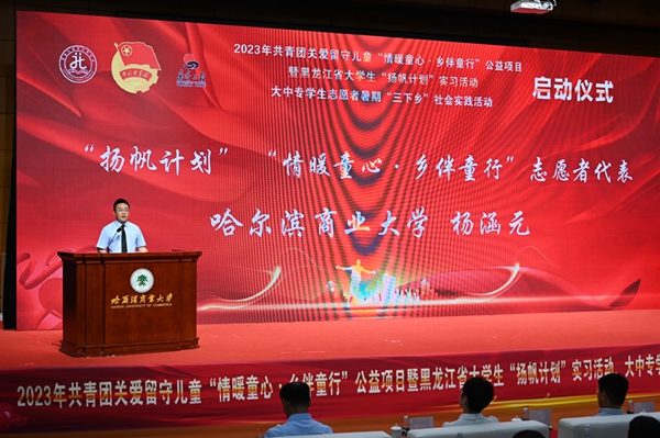 本次活動,在哈爾濱商業(yè)大學(xué)的大力支持下順利開展,哈爾濱商業(yè)大學(xué)副校長姜國鋒在儀式上致辭,他說:“學(xué)校建校71年來,立足立德樹人根本任務(wù),聚焦‘為黨育人,為國育才’的職責(zé)使命,在不斷加強(qiáng)‘第一課堂’建設(shè)的同時,還依托學(xué)校‘一體兩翼’文化育人模式,充分發(fā)揮實(shí)踐育人的作用,通過開展‘三下鄉(xiāng)’‘返家鄉(xiāng)’等社會實(shí)踐和‘西部計劃’‘興邊富民’志愿服務(wù)項目,引導(dǎo)廣大青年學(xué)生堅持用習(xí)近平新時代中國特色社會主義思想凝心鑄魂,在社會的課堂中‘受教育、長才干、作貢獻(xiàn)’?!被顒蝇F(xiàn)場,播放《黑龍江省希望工程30年與光同行》和黑龍江省大中專學(xué)生志愿者暑期“三下鄉(xiāng)”社會實(shí)踐活動宣傳片,與會領(lǐng)導(dǎo)上臺共同啟動了“情暖童心·鄉(xiāng)伴童行”公益項目、大學(xué)生“揚(yáng)帆計劃”實(shí)習(xí)活動、大中專學(xué)生志愿者暑期“三下鄉(xiāng)”社會實(shí)踐活動。