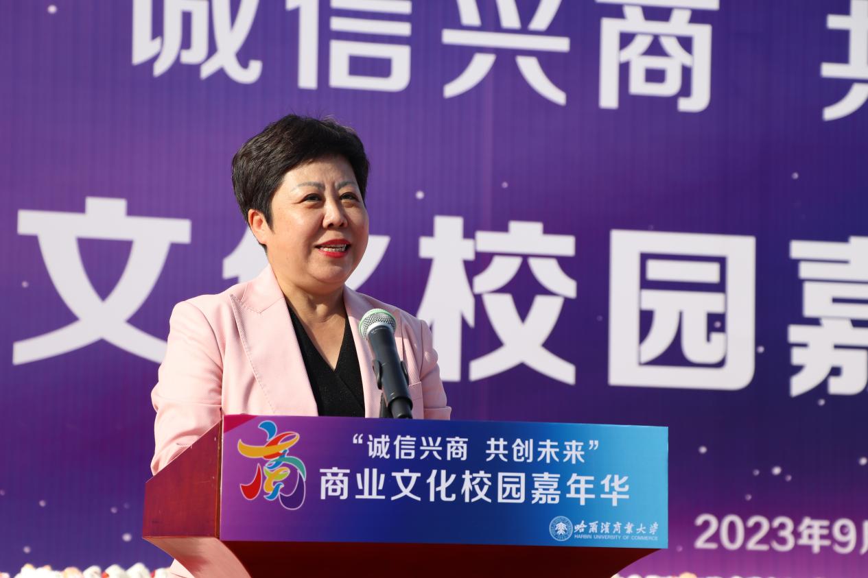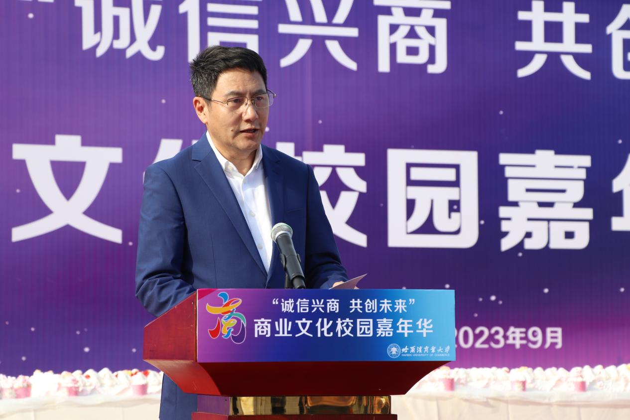 哈爾濱商業(yè)大學(xué)黨委書記孫先民致辭。他表示,誠信“軟實(shí)力”為高質(zhì)量發(fā)展提供“硬支撐”。本屆“誠信興商·共創(chuàng)未來”商業(yè)文化校園嘉年華活動堅(jiān)持以文化力量啟智潤心、固本培元,是深入學(xué)習(xí)貫徹習(xí)近平總書記在主持召開新時代推動?xùn)|北全面振興座談會和視察我省時的重要講話重要指示精神,全面落實(shí)立德樹人根本任務(wù)的務(wù)實(shí)舉措。哈爾濱商業(yè)大學(xué)作為新中國第一所多科性商業(yè)大學(xué),始終堅(jiān)持“大商鑄才、大雅育人、商雅兼?zhèn)洹⒔?jīng)世濟(jì)民”的育人理念,厚植師生“心懷祖國,至誠奉獻(xiàn),以商弘業(yè),矢志一流”的大商之道。活動將充分發(fā)揮老字號在文化引領(lǐng)、品牌建設(shè)、產(chǎn)業(yè)升級等方面的示范引領(lǐng)作用,彰顯龍江市場主體活力與創(chuàng)新力,聚焦建設(shè)“六個龍江”、推進(jìn)“八個振興”,筑牢堅(jiān)定龍江文化繁榮發(fā)展的自信根基,進(jìn)一步凝聚師生扎根龍江、服務(wù)龍江、建設(shè)龍江的情懷和力量。
