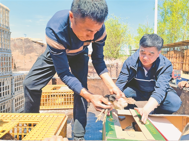駐村工作隊將捐贈的濱麻雞雞雛送到農(nóng)戶手中。本報記者 白云峰攝