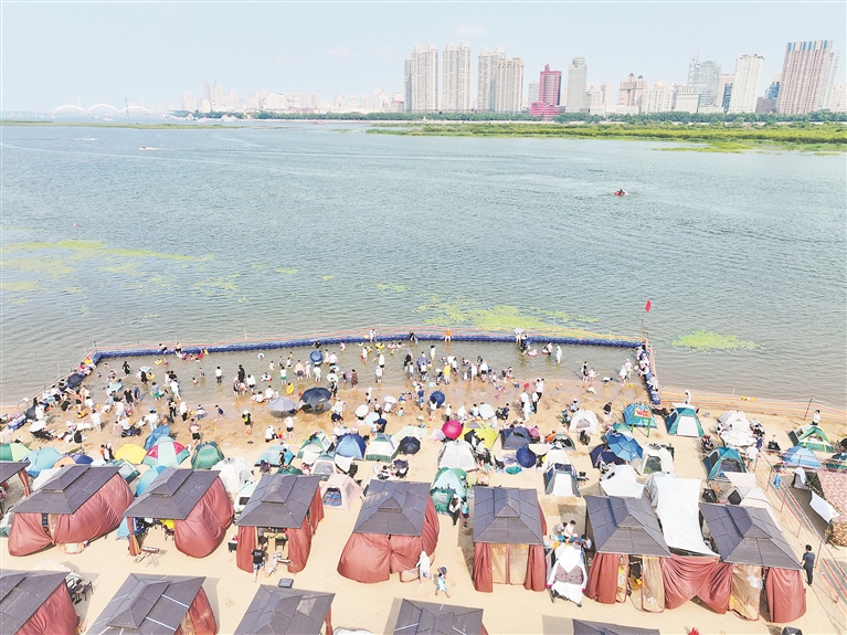 各個(gè)景區(qū)內(nèi),游客們撐起太陽傘,戴上遮陽帽,以抵御紫外線的照射。松花江畔的幾處浴場,人頭攢動(dòng),家長帶著孩子在這里戲水納涼。江邊的綠蔭里,滿是露營的帳篷,市民吃著冰西瓜、喝著涼啤酒,愜意地避暑。本報(bào)記者 張澍攝