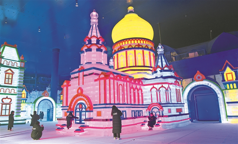 游客在伏天里走進哈爾濱冰雪大世界夢幻冰雪館,穿著厚厚的外套,打卡一座座美輪美奐的冰雕雪塑,體驗-12℃的浪漫。據(jù)工作人員介紹,自夢幻冰雪館開館以來,前來參觀的游客眾多,換衣處一直處于排隊狀態(tài),人數(shù)最多時要排出近百米。